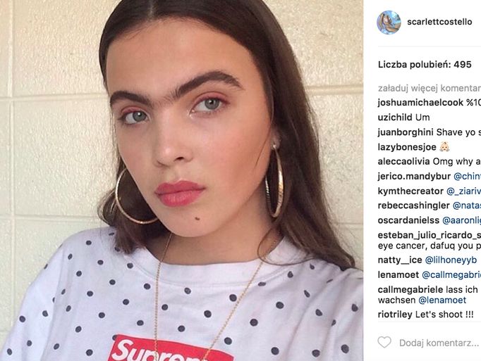 C’est le mannequin de 19 ans, Scarlett Costello, qui a eu l’idée d’afficher fièrement ses sourcils se rejoignant joliment. Mais pas que, la belle a aussi eu l’idée « ingénieuse » de montrer ostensiblement ses aisselles plutôt bien fournis.. ce n’est pas pour rien qu’elle a créée le buzz ! Certes, elle n’a pas pu esquiver les virulentes critiques la traitant de « féministe prétentieuse » et tout ce qui va avec, ceci dit elle s’est bien fait remarquer.