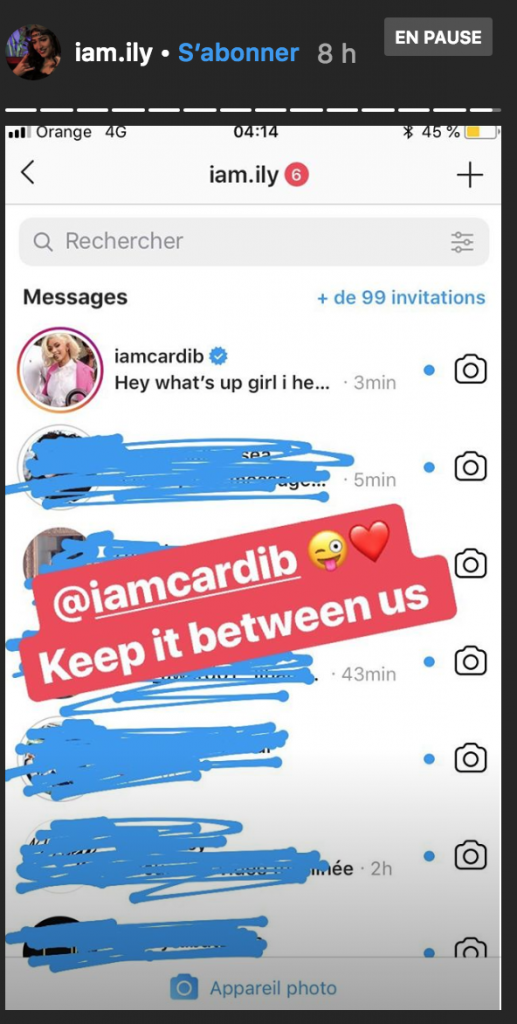Ce matin du 28 janvier de bonne heure, la chanteuse du rap marocain reçoit un message de la célèbre CardiB, rappeuse américaine.