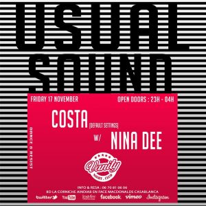 Le célèbre DJ français Costa et la DJette marocaine Nina Dee feront chauffer leurs platines ce soir au Vanity Club. Après avoir fait ses débuts en 1998 aux platines du célèbre folie’s pigalle à Paris, Costa a participé à la techno parade à paris en 2000 et a déjà mixé aux côtés de DJ freedy. Alors qu’il a mixé aux 4 coins du monde, Costa sera ce soir au Vanity Club !