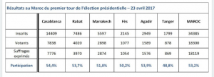 Macron arrive en tête du premier tour au Maroc avec un taux de votants de 31,6%. Il est suivi de près par François Fillon (Les Républicains) qui récolte 28,9% des voix. Le candidat de la France Insoumise, Jean Luc Mélenchon obtient quant à lui 25,8% des voix. Le candidat de gauche, Benoit Hamon remporte de son coté 5,7% des voix. Il est talonné par Marine le Pen, la candidate du Front National qui obtient 4,1% des voix.